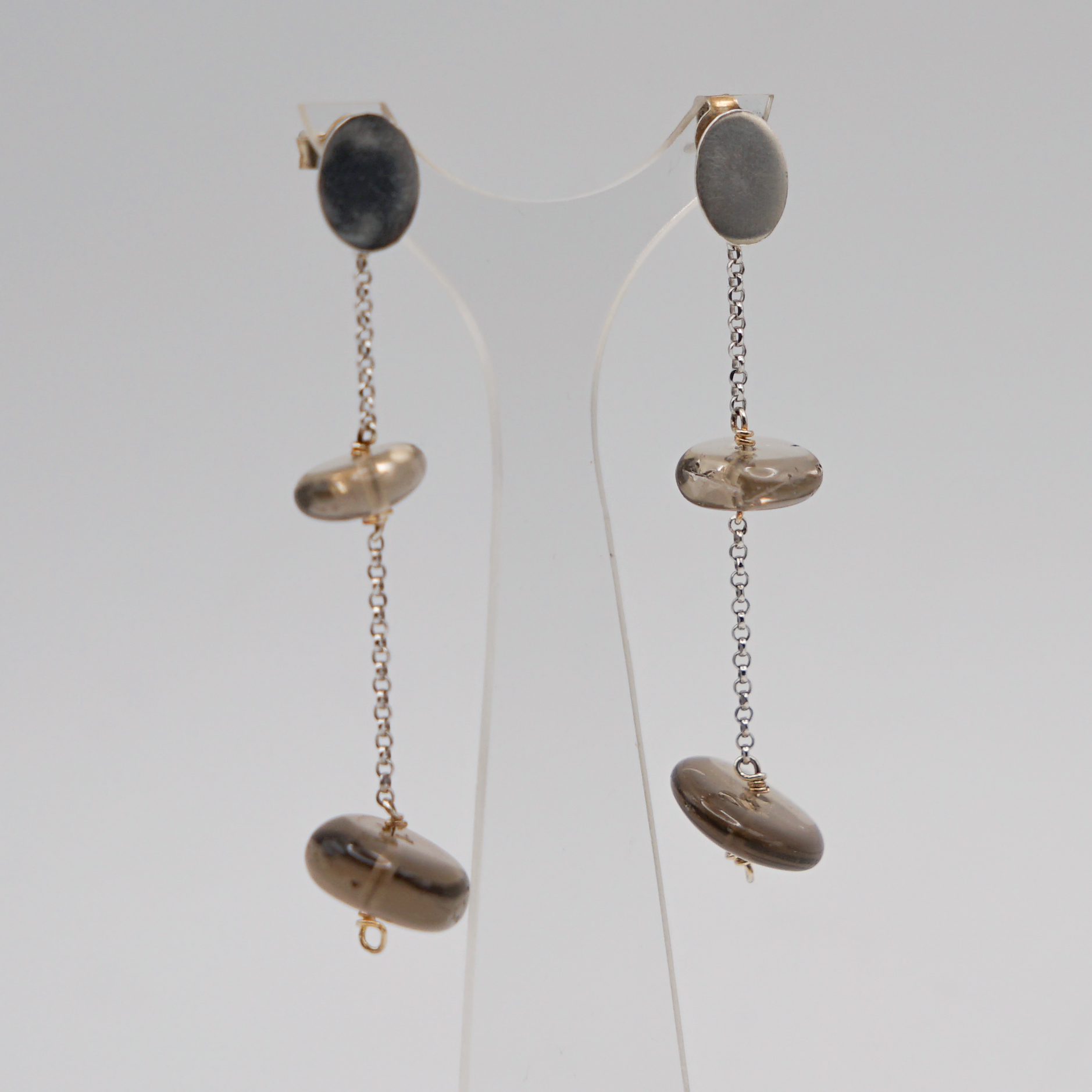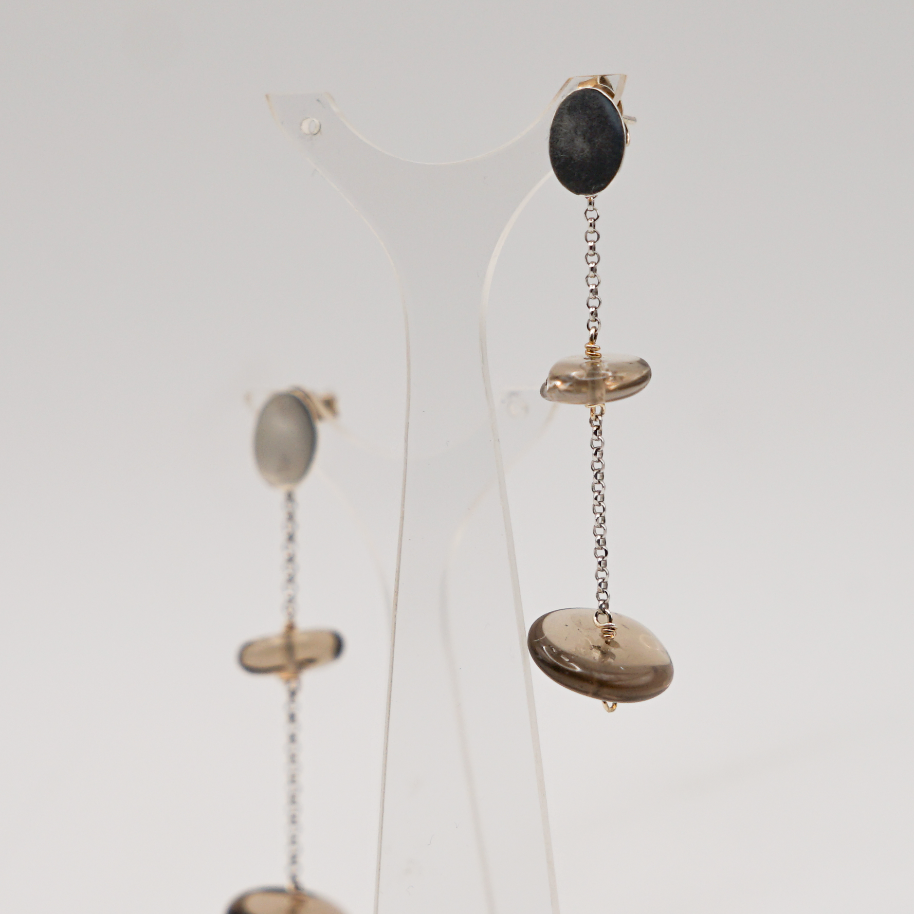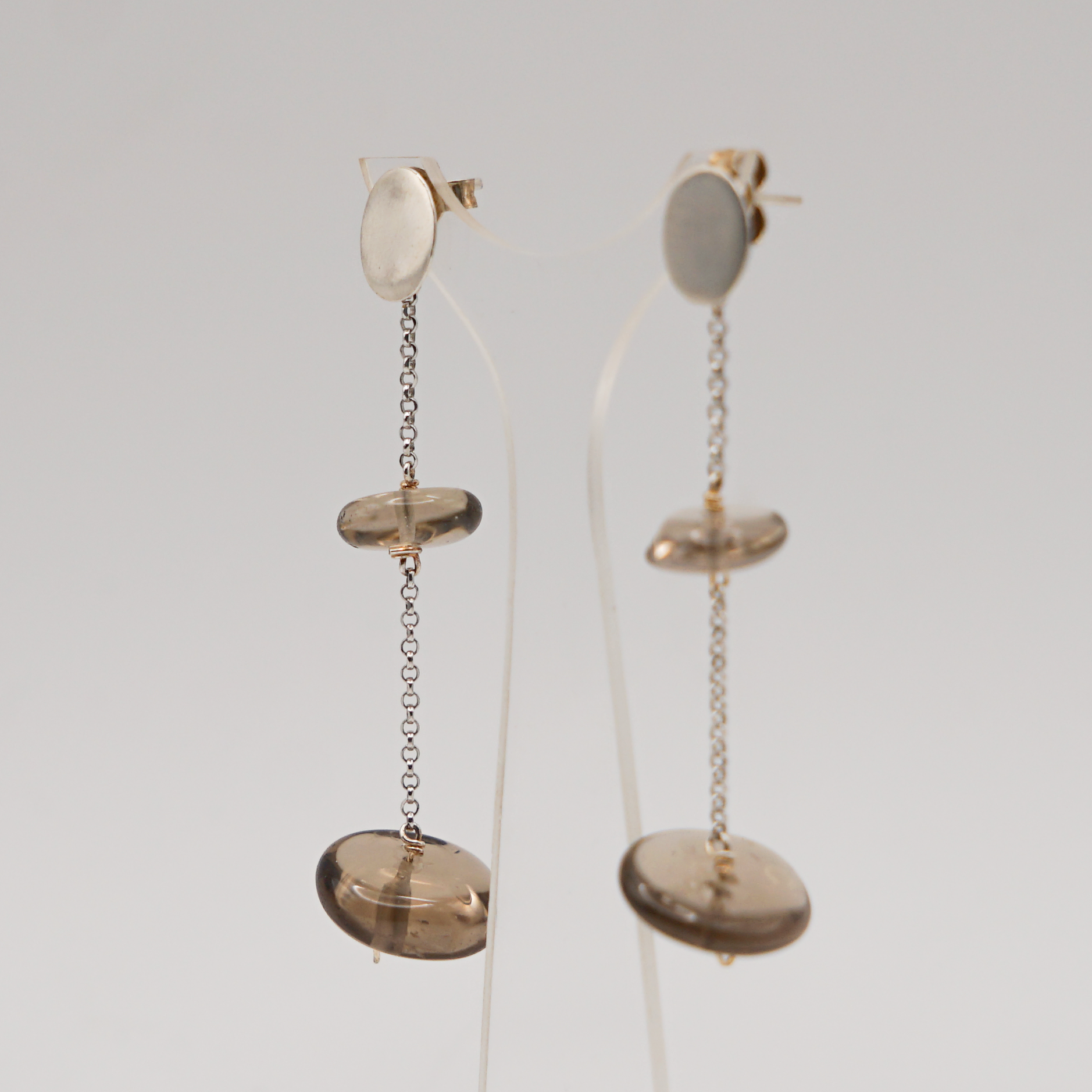 Aros de plata colgantes con cuarzo fumé. Medidas; Largo 6cm/ Ancho 1 cm.