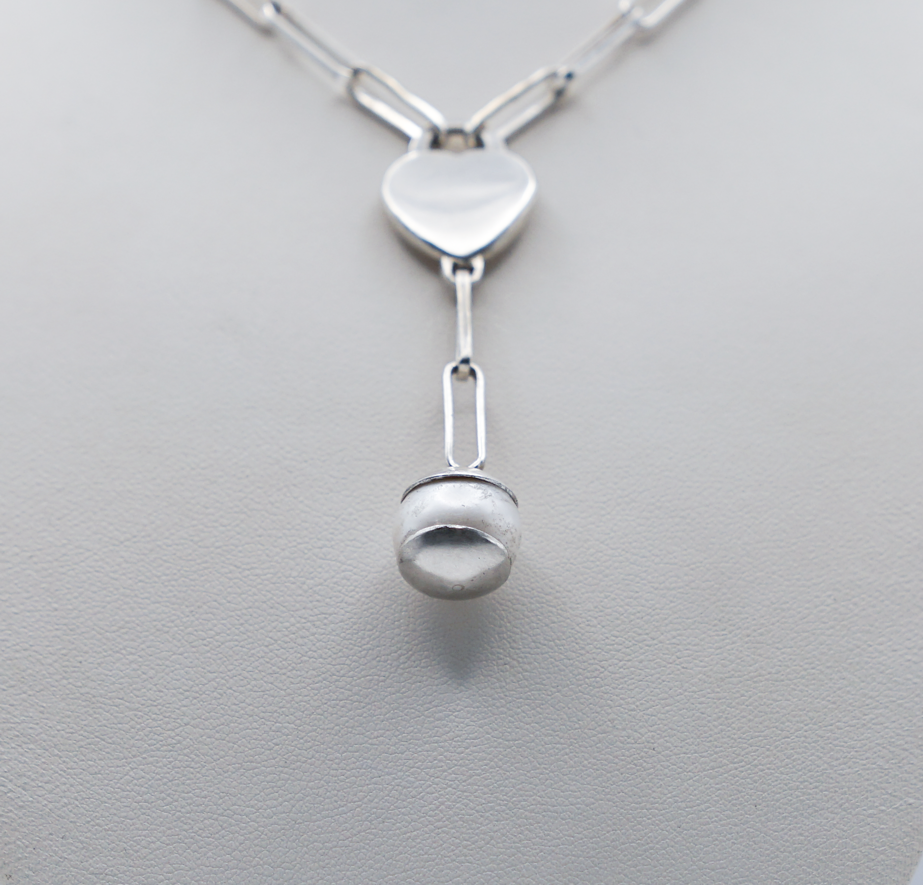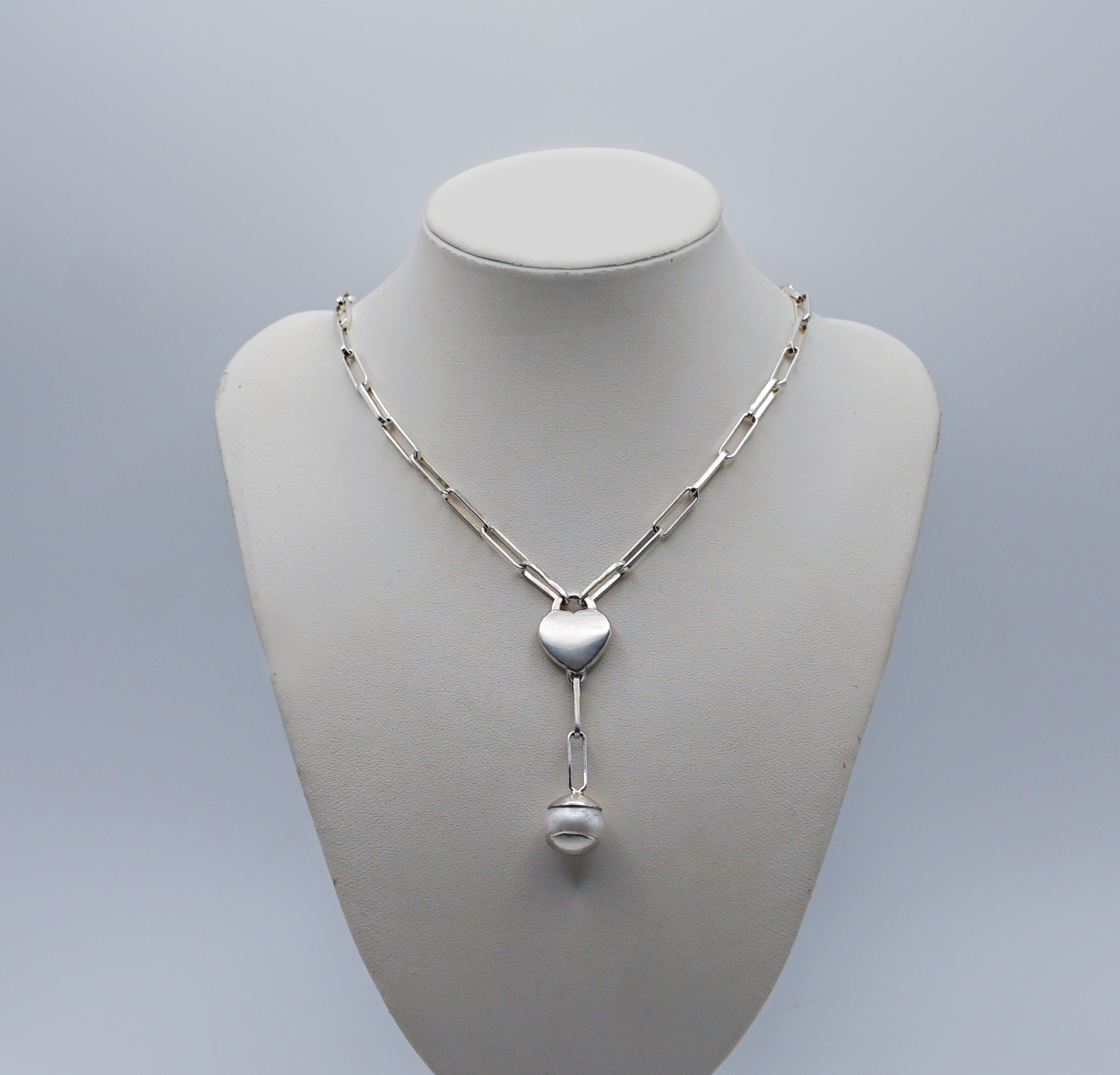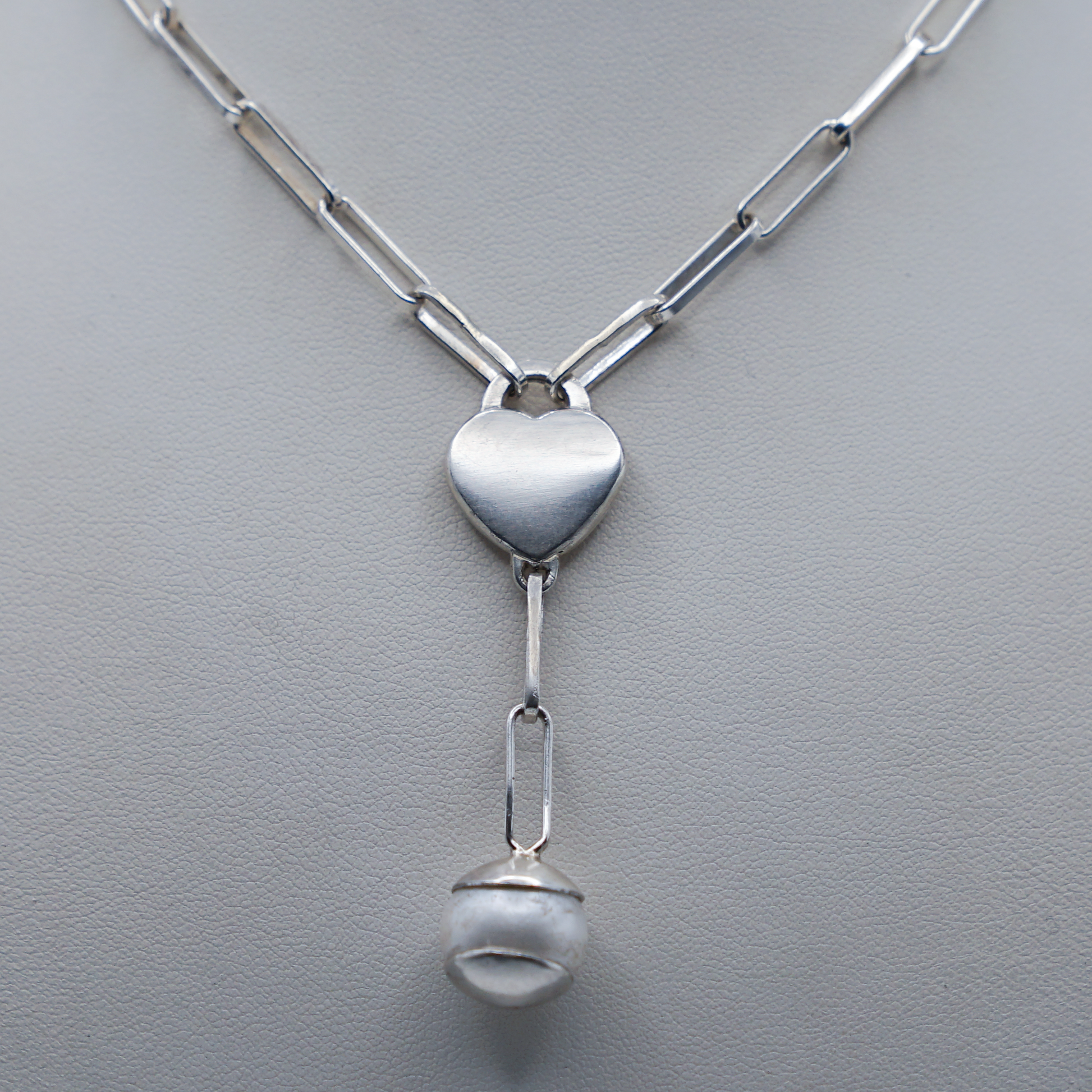Collar de plata 925, esta cadena de eslabón rectangular se une en el centro con un corazón y remata en una importante perla de 12mm de diámetro.