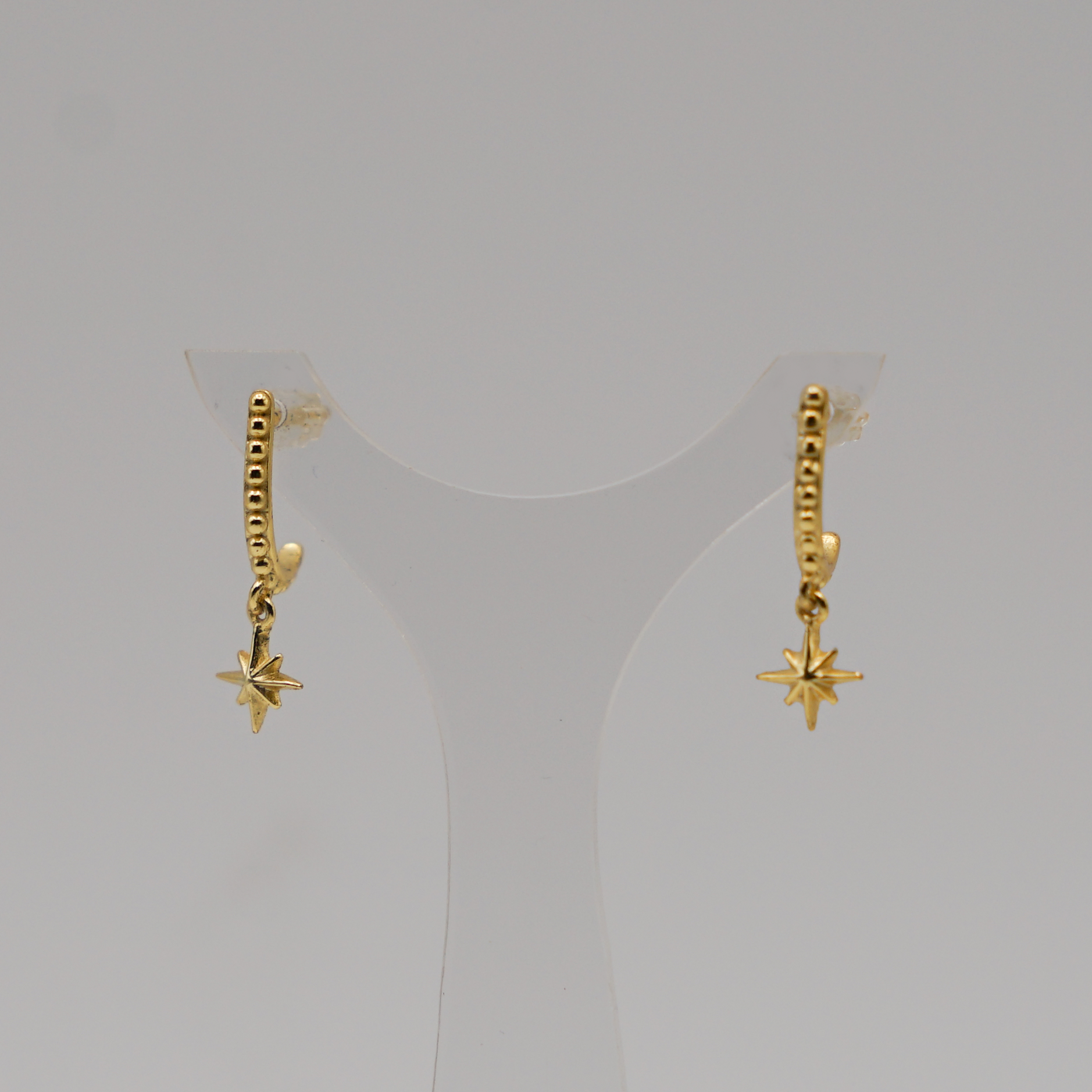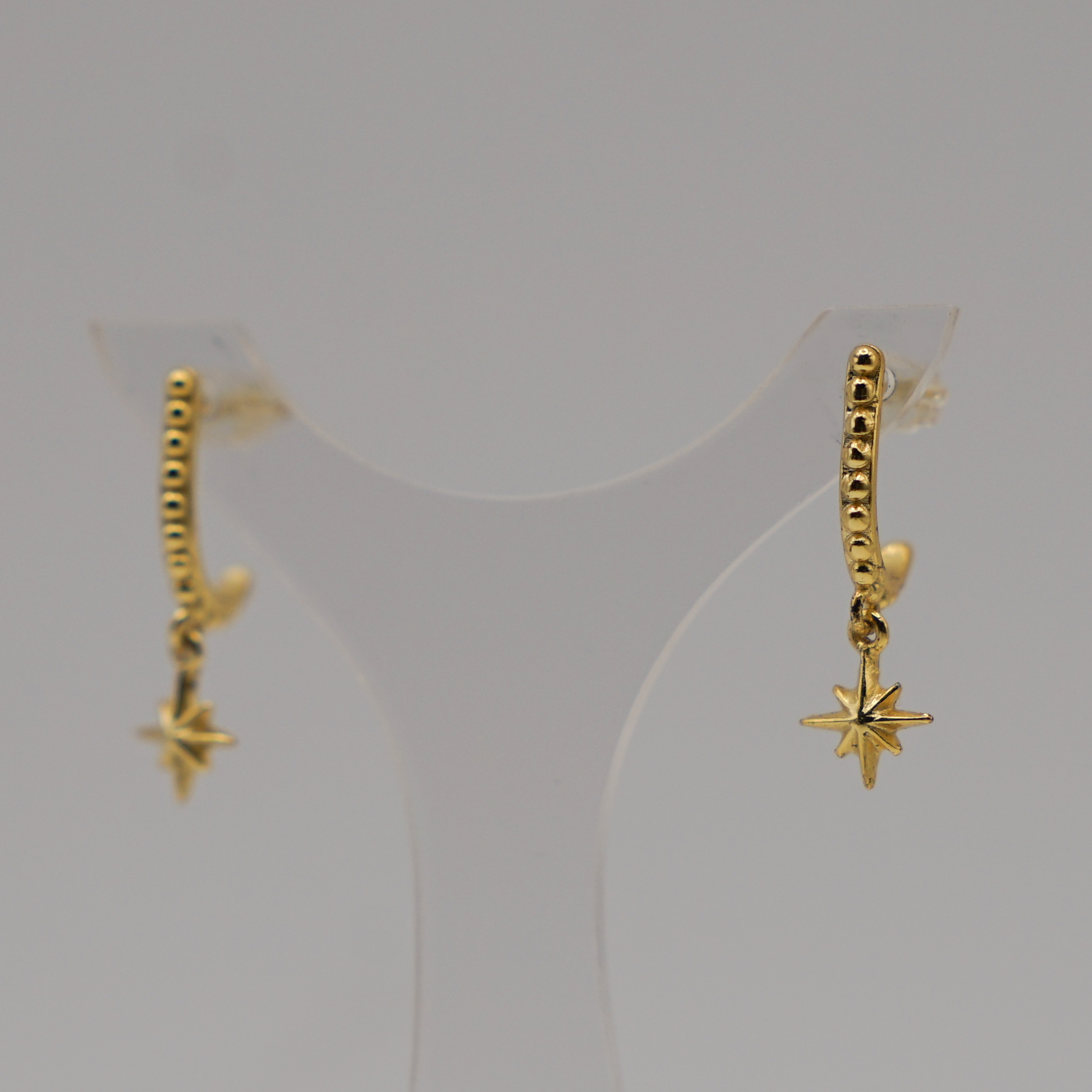 Aros de plata bañados en oro, media argolla con terminaciones de pelotitas y colgate de estrella.